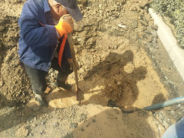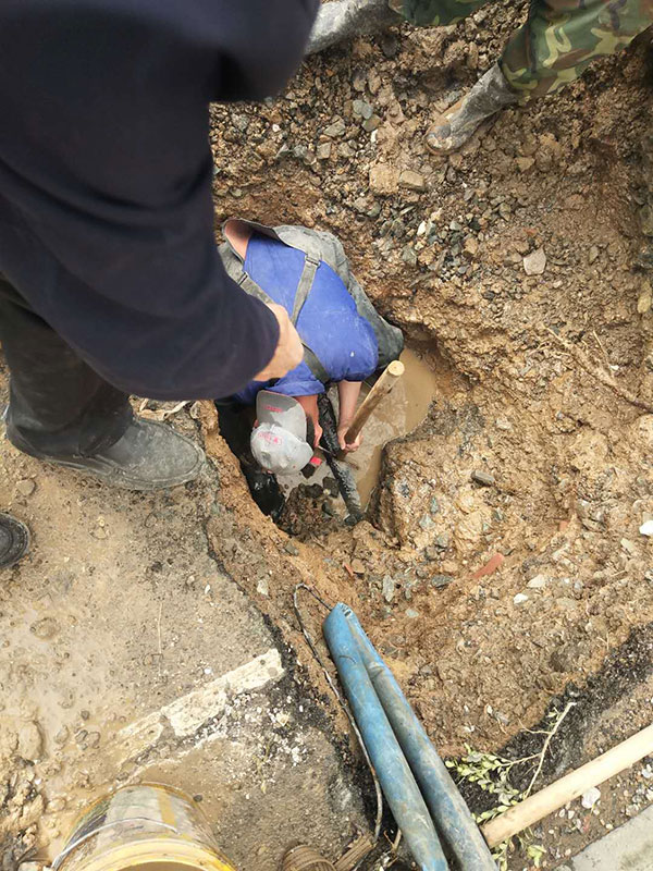 方案確定后,搶修人員立即行動起來,現(xiàn)場做好安全圍擋。為保障居民在用水高峰期的正常用水,現(xiàn)場指揮人員請示領導,定于4日晚上23點至5日凌晨5點關閉閥門停水施工,白天先進行挖基坑等準備工作。由于此處管線錯綜復雜,為避免損壞光纖、燃氣等其他管道影響居民生活,施工人員放棄使用挖掘機,而是采用人工開挖基坑。同時,搶修隊啟動了三臺抽水泵,邊抽水邊挖基坑。經過10個多小時的持續(xù)挖掘,終于把漏水點所在的管道全部挖出。經再次檢查,確定為鋼管銹蝕導致的漏水。此時已值深夜,居民大多進入了夢鄉(xiāng)。張班長冒著涼風深入環(huán)境惡劣的閥門井,關閉了供水閥門,準備實施破損管道維修。